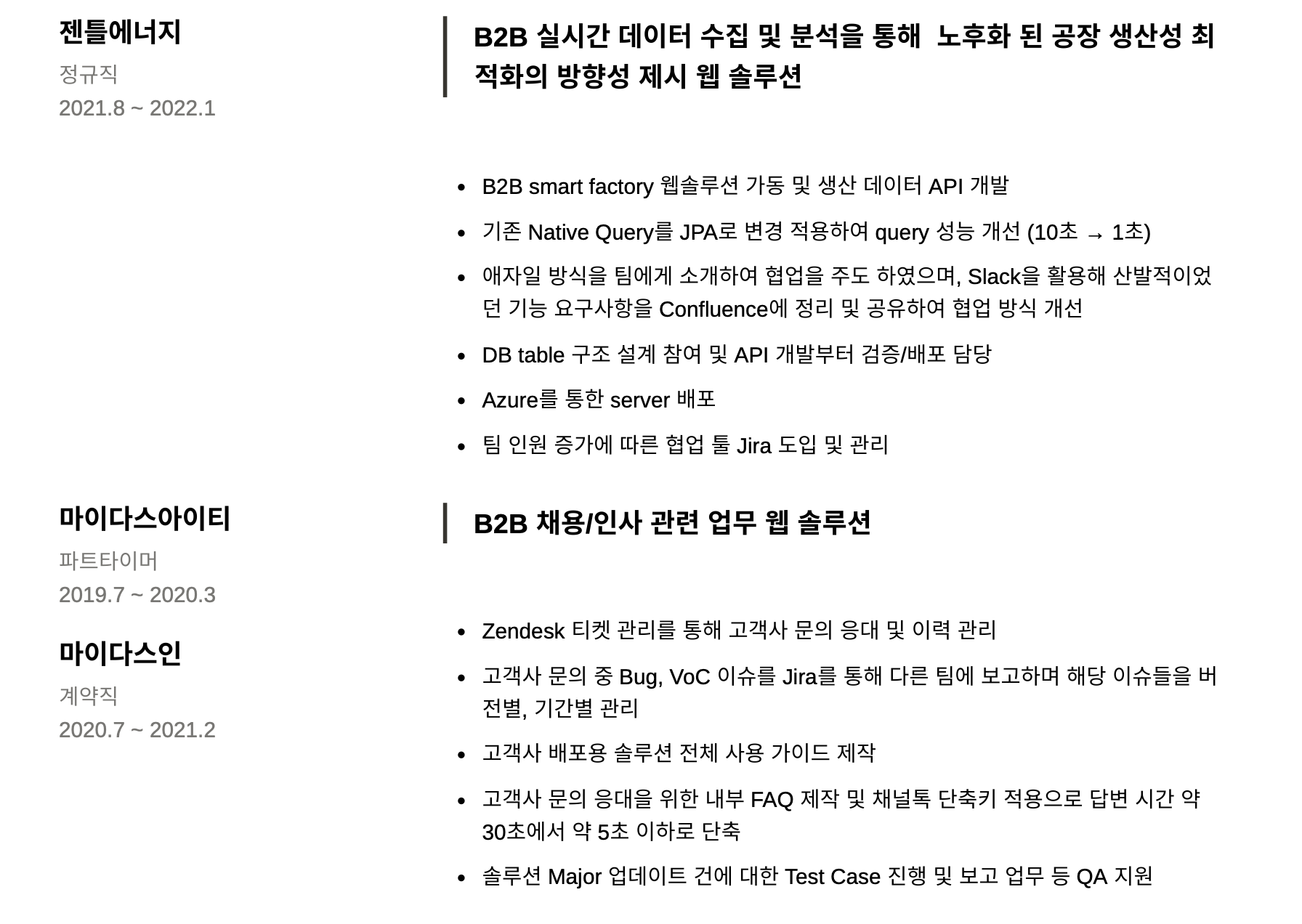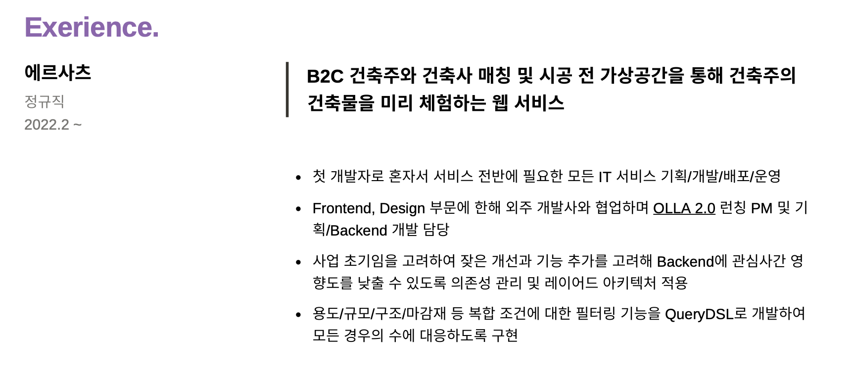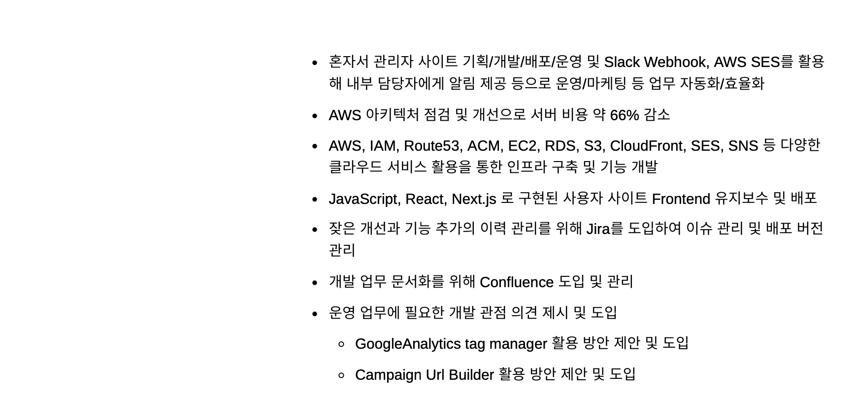 특히 바로 직전 회사에서는 단순히 개발해야 할 feature만 쳐내는 것이 아니라, 개발팀원이 나 혼자인 상황, 현실적 금전적 제약이 있는 상황을 고려해 아키텍처를 구성하고 인프라를 구축해야 했던 경험들이 컸다.