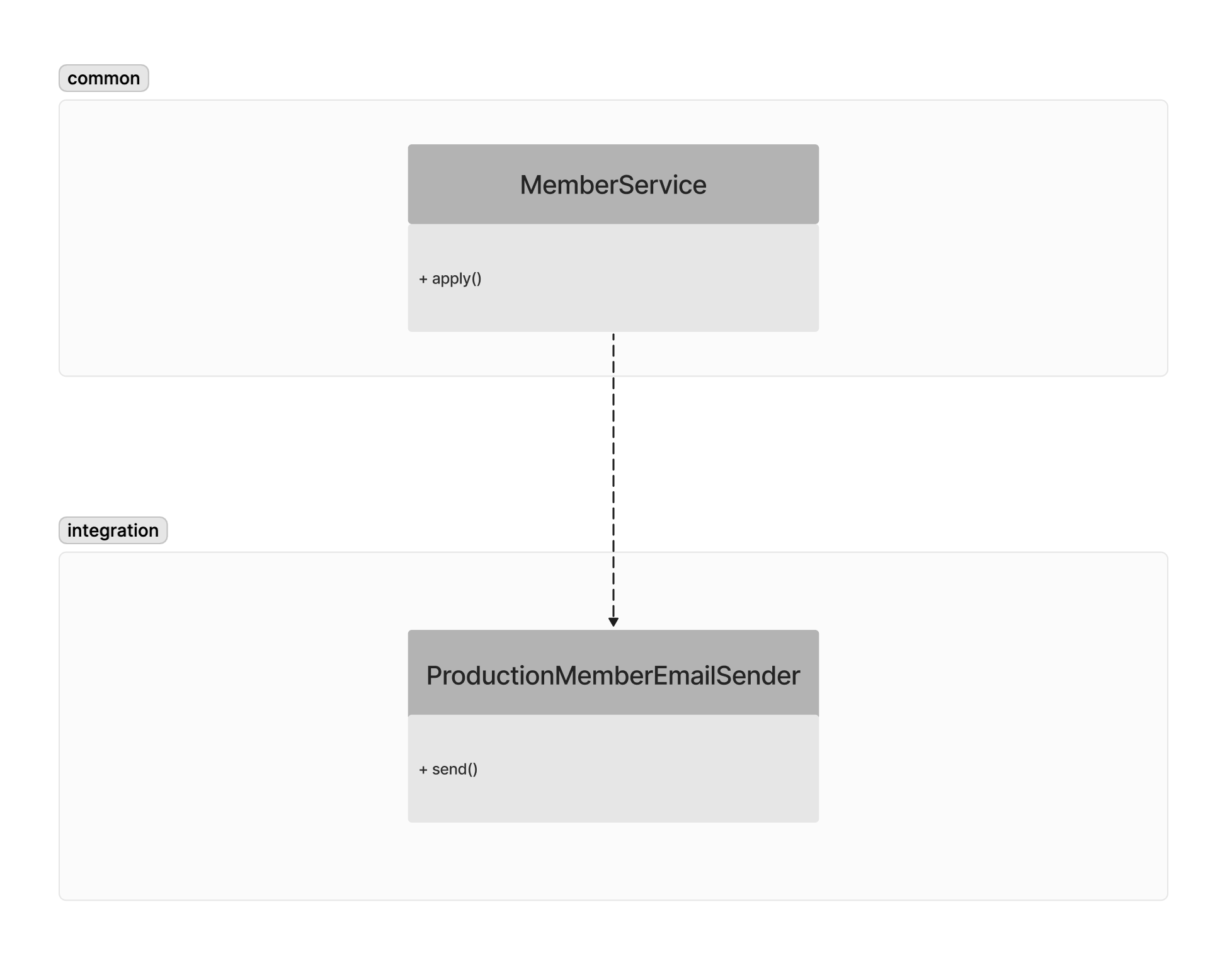 이때 발생할 수 있는 이슈는 테스트 코드인데, common module 테스트 코드에서 MemberEmailSender의 세부 구현이 없다고 징징거릴 것이다. 어차피 세부 구현에 대한 테스트는 integration module에서 이루어지면 되므로, common module에서는 TestConfiguration에 항상 성공하는 MemberEmailSender를 주입시켜 주면 된다.